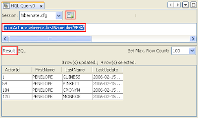 Test the connection by typing 'from Actor' (make sure the 'A' in 'Actor' is a capital letter) in the HQL Query Editor. Click the Run HQL Query in the toolbar. When you click Run HQL Query you should see the query results in the bottom pane of the HQL Query Editor.